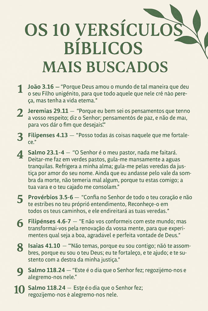 Esses versículos, embora escritos há milhares de anos, continuam sendo faróis de esperança. Eles revelam um Deus que ama, cuida, guia e transforma. Por isso, aparecem entre os mais buscados — porque falam à alma de quem precisa de consolo, força ou direção. Cada um deles traz uma mensagem atemporal: Deus está presente, Deus tem um plano, Deus é fiel.